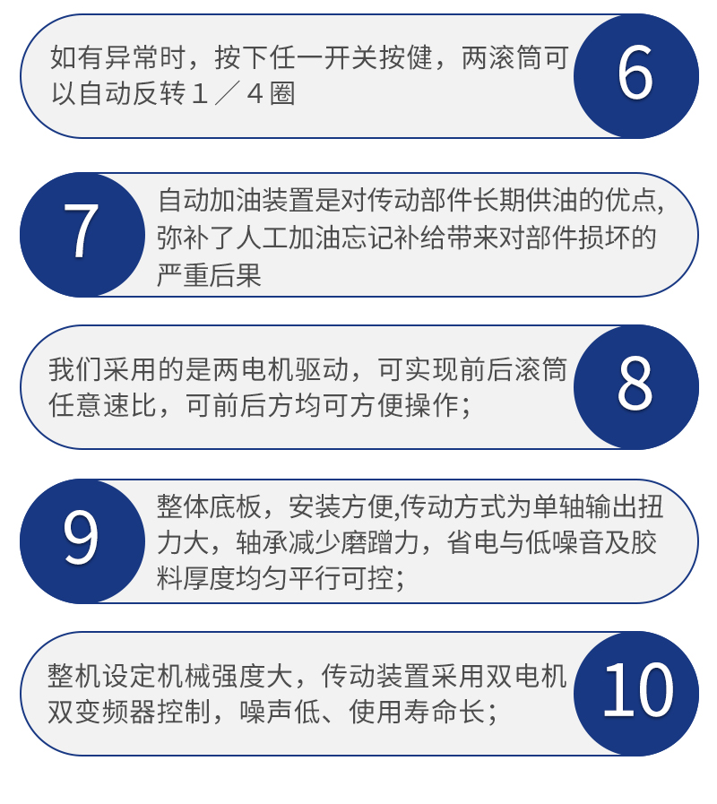 1:1.4輥筒硬度 50~60HRC 50~60HRC 50~60HRC 輥筒處理 鏡面拋光鍍鉻 鏡面拋光鍍鉻 鏡面拋光鍍鉻 輥筒間距 0.1~6mm可調 0.1~6mm可調 0.1~6mm可調 間距顯示方式 刻度/數顯 刻度/數顯 刻度/數顯 安全裝置 碰撞式緊急停止器 碰撞式緊急停止器 碰撞式緊急停止器 安全裝置數量 8個 8個 8個 特殊功能 緊急停止反轉 緊急停止反轉 緊急停止反轉 電機功率 2.2KW*2 3.7KW*2 5.5KW*2 電源電壓 3∮,AC380V 3∮,AC380V 3∮,AC380V 機臺尺寸 1240【長】×750【寬】×1400mm【高】 1240【長】×750【寬】×1450mm【高】 1750【長】×1100【寬】×1.55【高】 整機重量 ≈650kg ≈750kg ≈950kg