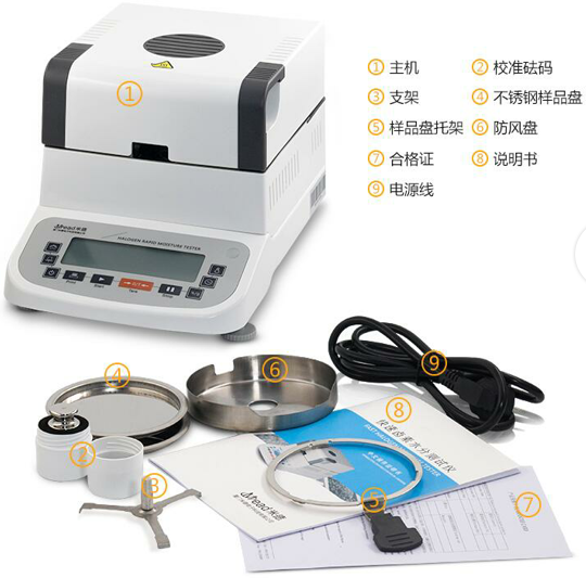水分儀主機;1臺 防風盤;1個 樣品盤支架;1個 樣品盤托盤 1個